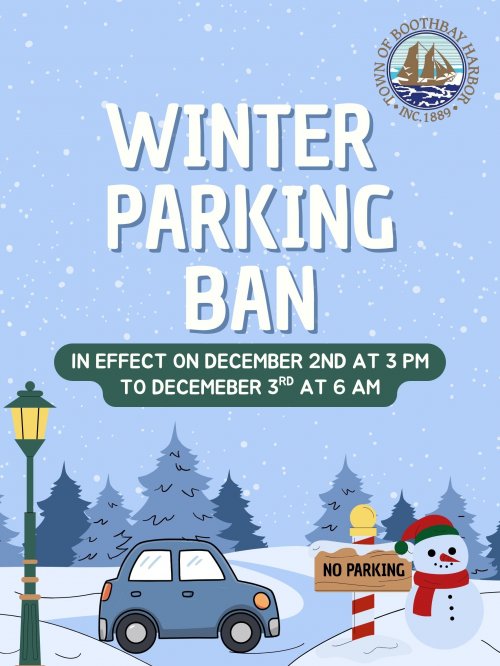Due to the incoming storm, the Town of Boothbay Harbor is enacting a parking ban from 3:00 P.M. 12/2/25, until the following day 12/3/25 at 6:00 A.M. If you need to park downtown, please use any of the municipal parking lots. Please drive with caution if you have to travel and give patience to our plow operators. Even after the storm is over, we still have several hours of work to do to get the roads safe for travel. Happy Winter!
